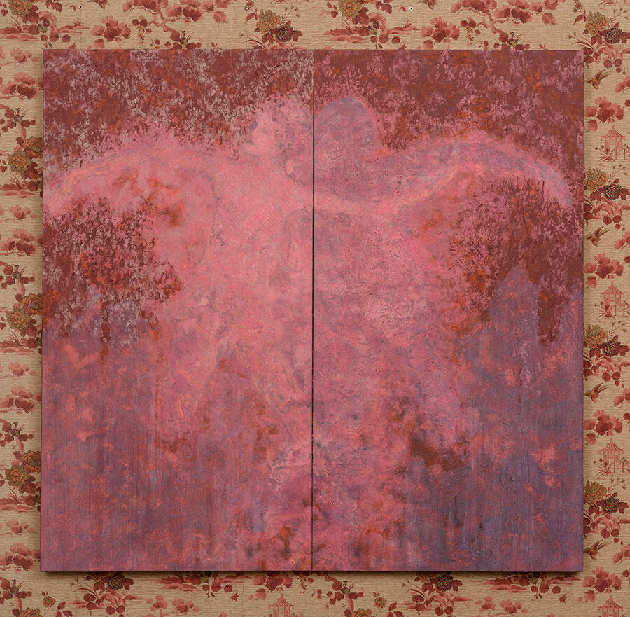 Located in the city’s historical ‘Macao’ district, the exhibition finds Bak animating the temporality of decay before sedimenting it in perfect stillness. In Inverting Metamorphosis (all works 2025), a swarm of grey figures appear to merge and trespass into one another, before entering a field of grey precipitation at the bottom of the canvas – or rather, before resurrecting to the top of the suspended levitation, overturning the cycle.Each mark swings between obfuscation and delineation. In Descenders II, wilting figures drift towards the foreground through a creamy haze. Faceless and spectral, their spineless bodies – painted with colours suggestive of flesh and wounds – sway with their bruised and fading limbs. Working at the threshold of disappearance, Bak occasionally treats his canvas as a palimpsest, scraping the old to make room for the new, where the remains of a past are subsumed – if not consumed – by what follows. The diptych Butterfly Composition depicts a pair of dancers shoulder to shoulder, arms outstretched like wings. Rendered in diffuse magentas and reds, the composition appears ablaze against the gallery’s peeling red chinoiserie wallpaper. With scarlet flames pouring down around them, the figures seem to smoulder, their muted skin relinquishing legibility into a layered oblivion.
