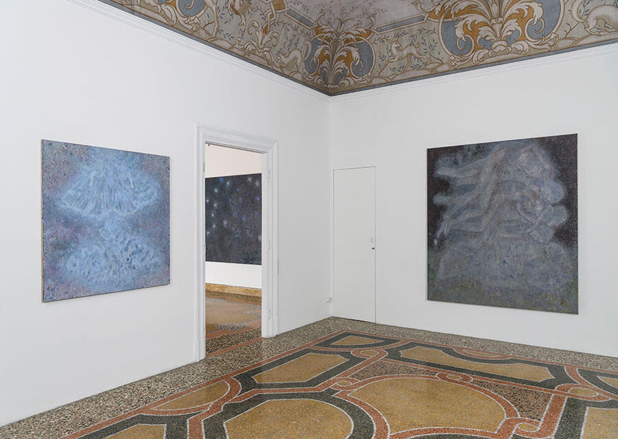 Oliver Bak, Swarmers (day), 2025, oil and wax on canvas, 123 × 127 cm; Swarmers (night), 2025, oil and wax on canvas,174 × 224 cm, Inverting Metamorphosis, 2025, oil and wax on canvas, 182 × 197 cm. Courtesy: the artist and Sprüth Magers; photograph: Giorgio BenniKnown for his murky paintings laden with illuminative potency, Oliver Bak’s true skill lies in the way he summons formal emergence and commands emotional gravity within his figurative abstractions. In his pictorial logic, time always supersedes place. His solo show, ‘Swarmers’, at Indipendenza in Rome sees the gallery’s interior – a former apartment featuring eroding ceilings, faded walls and mosaic marbles in subdued blues and browns – creep into Bak’s tableaux in fragments and flux, setting his surfaces abuzz with eerie vitality.