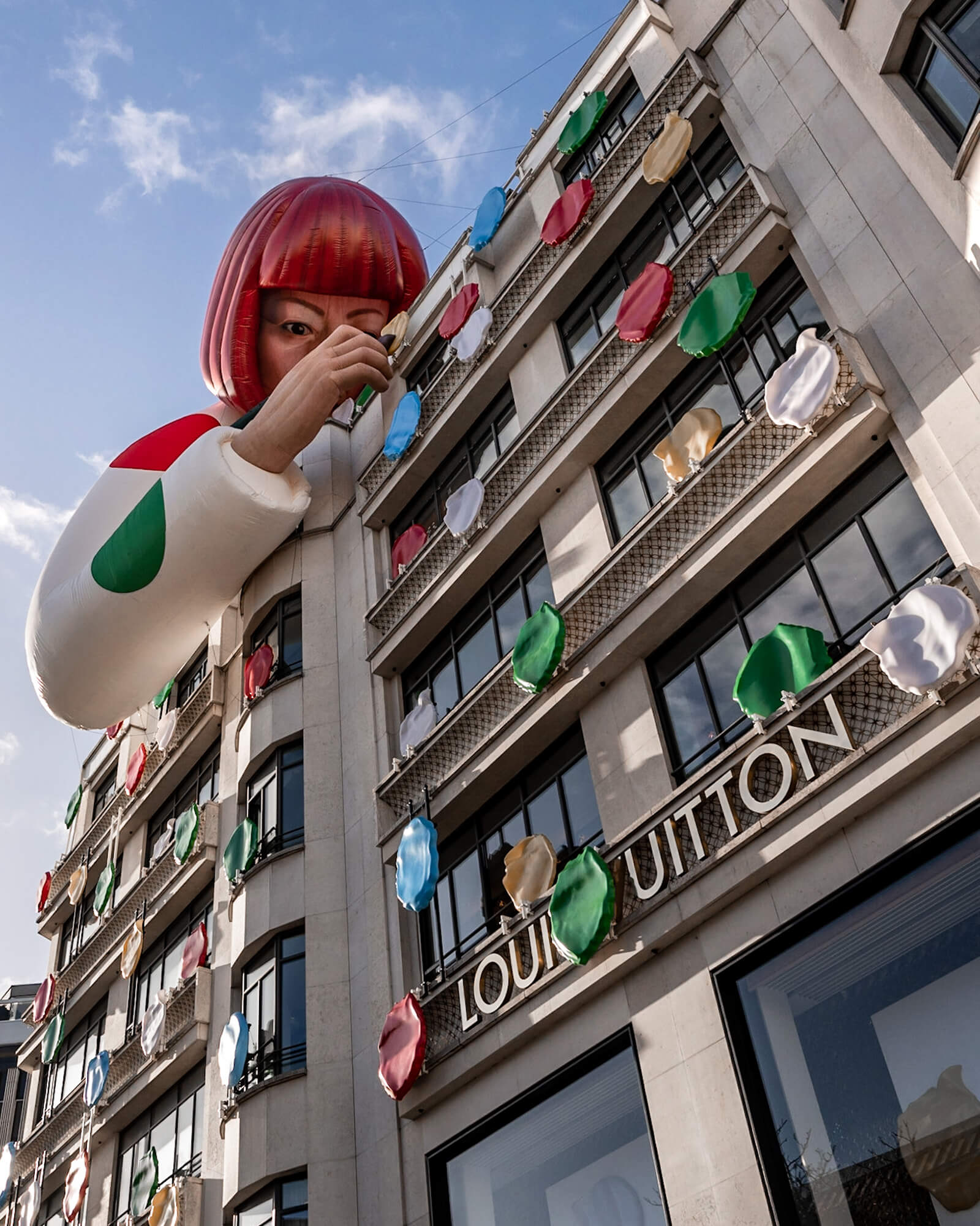 A massive inflatable figure of Kusama looms over the Louis Vuitton flagship store in Paris